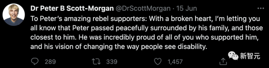 推特中写道,“彼得一直以来都有很多坚定的支持者和粉丝。但是我不得不怀着悲痛的心情告诉所有朋友们,彼得刚刚去世了。他走的很安详,病床边上围满了他的家人和他最亲近的人。我想说,彼得很感谢你们所有人一直以来的支持,他也很自豪,能够为残疾人出一份力。”
